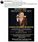 I assume this is legit. This casting director is contacting U.S.A. Shania fans like myself on Twitter to compete against each other on an upcoming TV show and spend the day with Shania. Must be 18 or older.