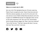 Not Just A Girl (The Highlights) Track List: 1 Not Just A Girl 2 You’re Still The One 3 Man! I Feel Like A Woman! 4 What Made You Say That – Single Version 5 (If You’re Not In It For Love) I’m Outta Here! 6 Whose Bed Have Your Boots Been Under? 7 Any Man Of Mine 8 You Win My Love 9 Don’t Be Stupid (You Know I Love You) 10 I’m Holdin’ On To Love (To Save My Life) 11 From This Moment On 12 Love Gets Me Every Time 13 That Don’t Impress Me Much 14 Forever And For Always (Red Version) 15 Honey, I’m Home 16 I’m Gonna Getcha Good! (Red Version) 17 Up! (Green Version) 18 Life’s About To Get Good